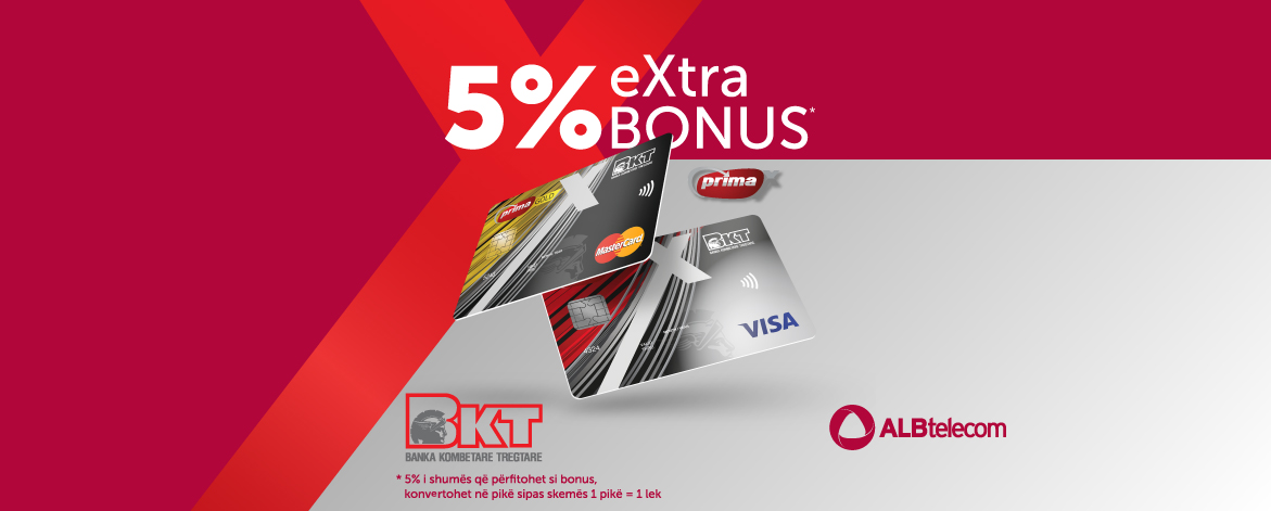 eXtra Bonus ALBtelecom!Pay with your Prima credit card in all the ALBtelecom shops and earn 5% eXtra Bonus in every purchase! eXtra Bonus is earned only with payents done in physical POS in ALBtelecom Moreover, you can choose to pay up to 12 installments with 0% interest with your Prima credit card! Prima, the card of eXtra possibilities