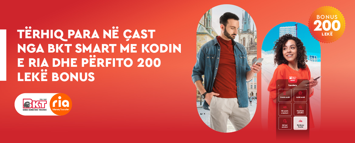 Cashback Bonus – 200 ALL / 2 EUR / 2 USD / 2 GBP is granted to each client who performs their first transaction with RIA Money Transfer in BKT Smart during the campaign period.