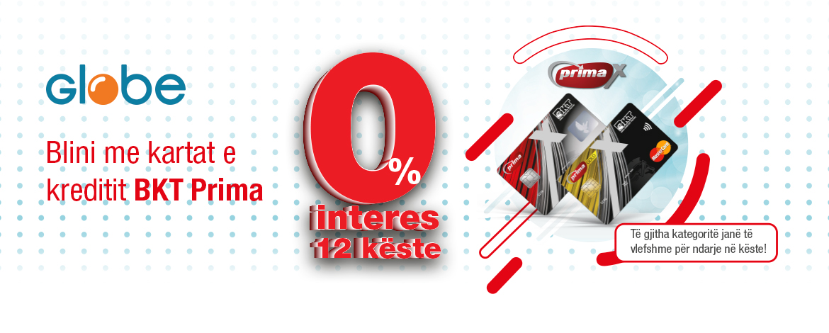 Bli me kartat e kreditit BKT Prima në GLOBE dhe ndaj blerjet nga 2-12 këste me 0% interes! Të gjitha kategoritë janë të vlefshme për ndarje në këste!