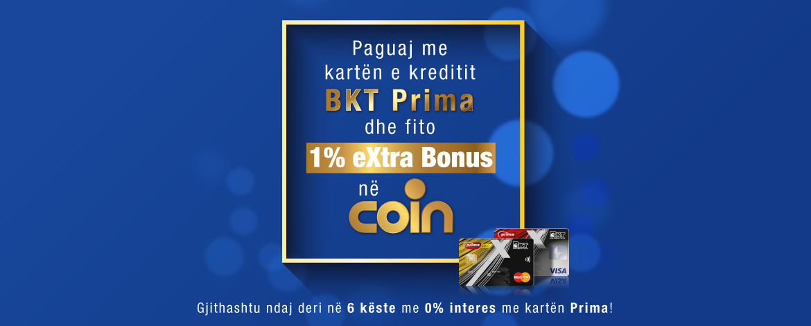 Blini me kartat e kreditit BKT Prima në COIN dhe ndani blerjet nga 2-6 këste me 0% interes! Gjithashtu në blerjet normale ju mund të përfitoni 1% eXtra Bonus së shumës totale të shpenzuar!