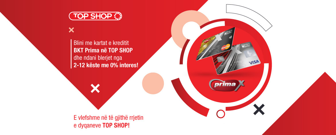 Blini me kartat e kreditit BKT Prima në TOP SHOP dhe ndani blerjet nga 2-12 këste me 0% interes! E vlefshme në të gjithë rrjetin e dyqaneve TOP SHOP!