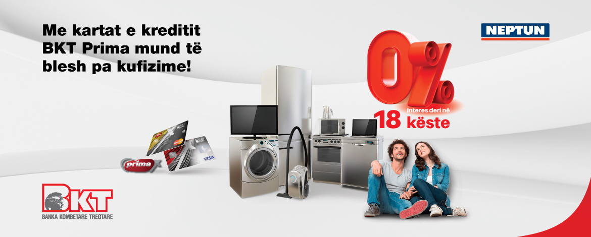 Blini me kartat e kreditit BKT Prima në të gjithë rrjetin e tregtarëve Neptun dhe ndani blerjet nga 2-18 këste me 0% interes!