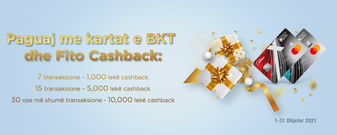 Kartat e debitit dhe kartat e kreditit do të jenë pjesëmarrëse. Nëse përmbushini kushtet në dy ose më shumë karta, debiti dhe krediti, ju do t’a përfitoni cashback-un vetëm në njërën kartë, vetëm 1 herë (kartën e kreditit).