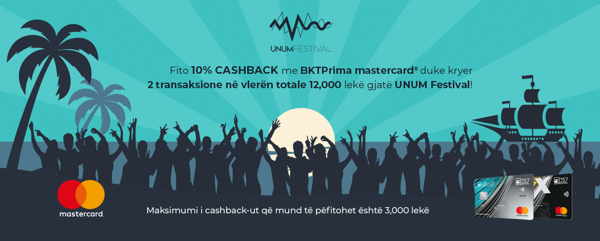 Festo, paguaj dhe fito CASHBACK me BKT Prima mastercard®! Duke paguar me kartat BKT Prima mastercard® në Unum Festival ju merrni 10% të shumës së shpenzuar si cashback!