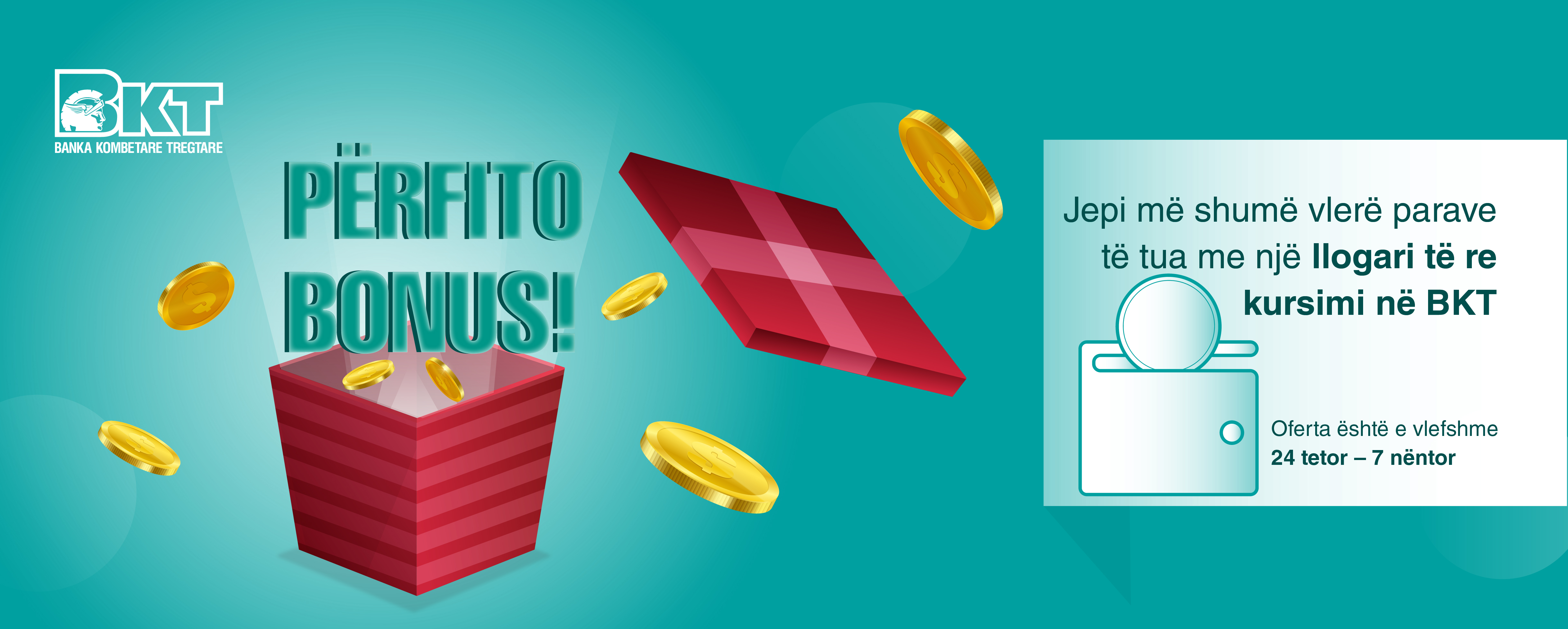 Çdo klient që hap një llogari kursimi të re nga data 24 tetor deri më 7 nëntor 2022 përpos interesave kreditues preferencialë do të përfitojë si BONUS në llogarinë e tij të kursimit 400 ALL neto ose 2 EUR/USD/GBP sipas monedhës së huaj.