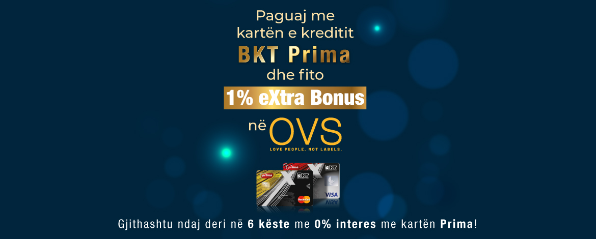 Blini me kartat e kreditit BKT Prima në OVS dhe ndani blerjet nga 2-6 këste me 0% interes! Gjithashtu ju përfitoni 1% të shumës totale si eXtra Bonus nëse paguani me kartat e kreditit BKT Prima!