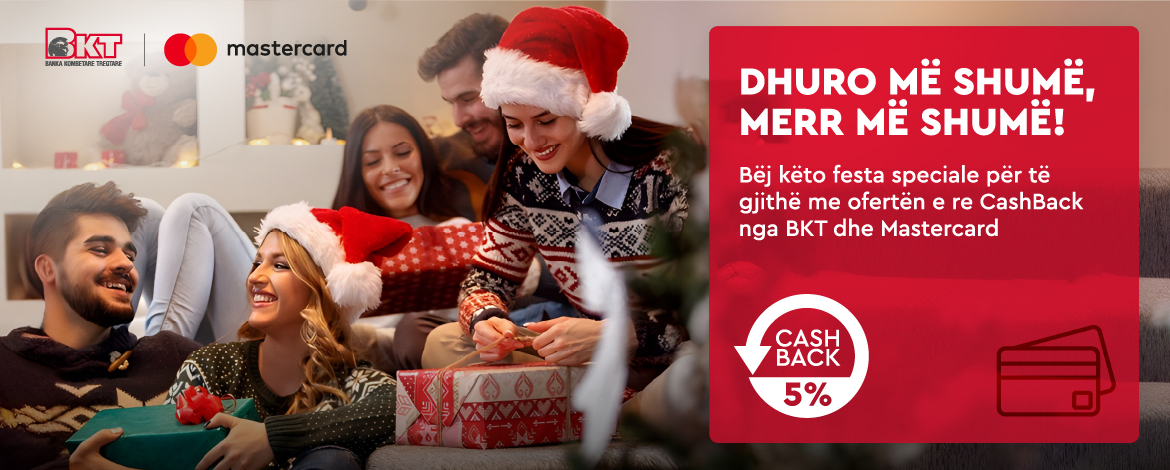 Blerjet me kartat e BKT (Mastecard) nuk kanë qënë ndonjëherë më shumë shpërblyese se këtë periudhë festive. Duke plotësuar kushtet si mëposhtë përfitoni 5% “cash back” për të gjithë blerjet tuaja.