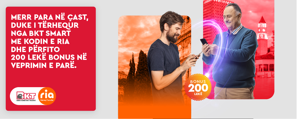 Bonus Cashback – 200 Lekë, jepet për çdo klient që kryen për herë të parë një transaksion me RIA Money Transfer në BKT Smart gjatë periudhës së fushatës.